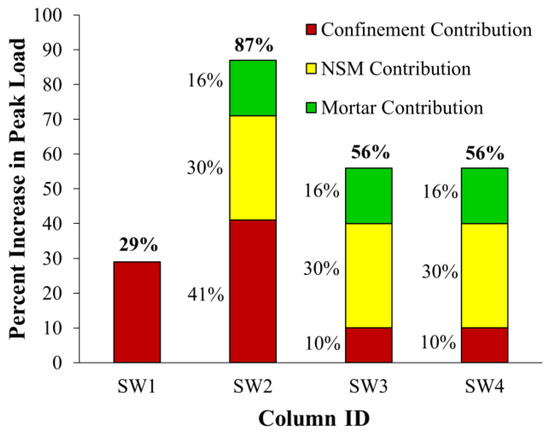 Based on the FE results of the studied columns, Figure 25 was plotted to illustrate the percent of peak load increase for each strengthening scheme with respect to the control specimen CW. The FE results confirmed that schemes 1 and 2, respectively, provided the lowest and highest peak load increase. Based on the results of the FE modeling, the contribution of each part of the strengthening scheme is also shown in Figure 25. It is generally assumed that the load enhancement due to strengthening is divided into three parts: an increase provided by NSM rebars, an increase due to the increased compressive strength of epoxy mortar, and an increase provided by section confinement. The contribution of each part was approximately calculated from the following equations.