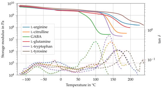 Figure 3 shows the storage modulus and loss factor of the amino-epoxides. All thermosets possess a peak in at around . This could mean that the relaxation mechanism is related to the structure of DGEBA or some part of the molecular structure that all amino acids have in common. Usually, this -relaxation is attributed to the hydroxy ether and diphenyl propane groups of DGEBA [,,]. Additionally, l-glutamine shows a peak of at about . This relaxation maxima might result from the free rotation of the carbonyl group.