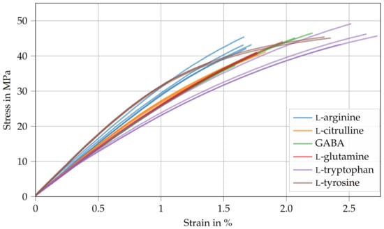 Rothenhäusler et al. [] investigated the mechanical behavior of DGEBA cured with l-arginine at T = , 22 , and 80 . Here, the tensile, compression and flexural strength at 22 are about 56 , 98 and 85 , respectively. Additionally, they found an intrinsic toughening effect caused by the finely dispersed amino acid particles which leads to a of about .