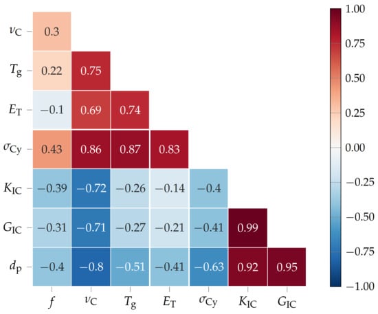 After presenting the thermo-mechanical, tensile, flexural, compression, and fracture toughness properties of the amino-epoxides, it is time to discuss the interdependencies of key material properties. The Pearson product moment correlation coefficients R [] (see Figure 5) of the functionality f, cross-link density , glass transition temperature , Young’s modulus , compression yield strength , critical stress intensity factor in mode I , fracture energy , and diameter of the plastic zone of the amino-epoxides were calculated via numpy.corrcoef() in Python 3.8.0 [].
