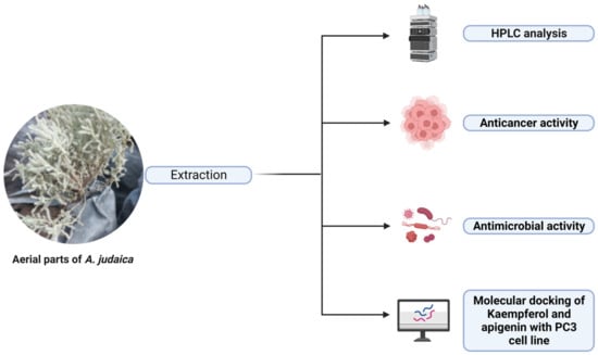 Image showing aerial parts (above the soil) of Artemisia judaica (plant), which underwent successful extraction methods and multiple relevant assays to determine the phytochemical, antimicrobial, and antitumor activities of the extracted product. This figure was created with BioRender.com.