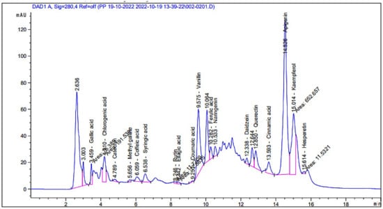 Although the phytoconstituents of A. judaica were previously detected in several studies [,], they may differ based on growing conditions, climatic conditions, cultivar soil, the age of plant, and the flowering state; thus, the analysis of the plant extract was performed in this study. HPLC analysis for the A. judaica extract (aerial parts) revealed the presence of 18 known compounds (Figure 1), with their exact concentrations (Table 1 and Figure 2) and chemical formulas (Figure 3), but another 4 unknown compounds were also detected. Among the 18 known compounds, kaempferol, apigenin, and chlorogenic acid were revealed with the highest concentrations (3916.34, 3794.32, and 1089.58 µg/mL, respectively), while the lowest concentrations were noted for coumaric acid (5.46 µg/mL) and methyl gallate (27.68 µg/mL). The phytochemical profiles of the extract indicated that the aerial parts of A. judaica were very rich in phenolic and flavonoid compounds. Chlorogenic acid, luteolin, apigenin, rutin, and other compounds were reported in the extract of Artemisia gmelinii []. The identified compounds for A. judaica were reported, with various biological activities, i.e., kaempferol, which is a flavonoid compound, showed success toward the treatment of inflammatory responses, liver injuries, diabetes, malignancy, and obesity []. In addition, a recent study has claimed the promising potential therapeutic use of kaempferol, alone or in combination with colistin, to treat infections caused by drug resistant bacteria [].