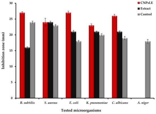 Recent reports have claimed that CNPs possess a great promise for use in different medical applications through various technologies/approaches, including nanomedicine and biomedical engineering, for either enhancing their effectiveness or novel discovery [,]. CNPs loaded with Artemisia judaica extract (CNPsLE) were more effective than the extracts alone against all tested microorganisms, except Staphylococcus aureus (Figure 4 and Figure 5); this might be due to the differences in the cell wall compositions, virulence factors, or specific resistance mechanisms.