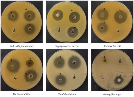 Modified Mueller–Hinton agar and potato dextrose agar media were used for the growth of the tested bacteria and fungi, respectively. The agar well diffusion method was utilized to estimate the antimicrobial activity of the extract alone and when combined with CNPs. Bacterial isolates were collected from Ain Shams University Hospital, Egypt, while the mycology laboratory at Assiut University, Egypt, provided the research team with requested fungal isolates. The appropriate agar plate was individually inoculated with the tested microbe, including Staphylococcus aureus [ATCC 6538], Bacillus subtilis [ATCC 6633], Escherichia coli [ATCC 8739], Klebsiella pneumonia, Aspergillus niger, and Candida albicans [ATCC 10231], using sterile swabs. Next, a well (6 mm diameter) was formed using a sterile cork-borer, which was then filled with 100 µL of the tested sample. Then, agar plates inoculated with bacteria were incubated at 37 °C for 24 h, whereas about 72 h of incubation at 30 °C were used for fungal growth. The inhibitory zones around the wells were measured in millimeters (mm). Inhibitory zones caused gentamycin and clotrimazole against tested bacterial, and fungal isolates were used as positive controls, respectively [].