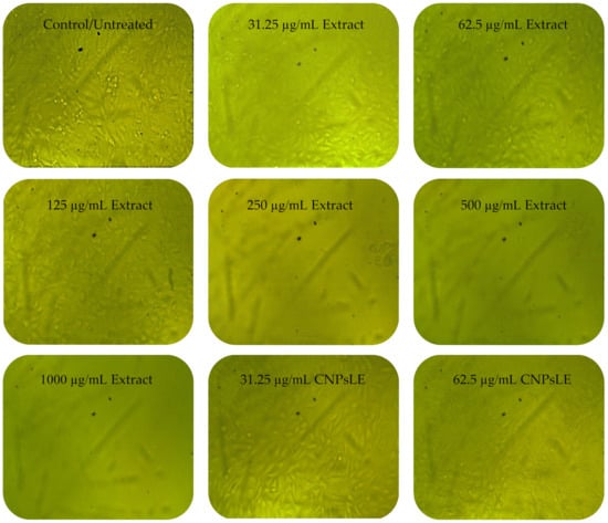 Cytopathic effects (CPEs) were not observed on normal Vero cells treated with the A. judaica extract ≤ 62.5 µg/mL, while moderate CPEs were documented at 125 µg/mL (Figure 6). In addition, CPEs and the reduction of viable cells, or the complete absence and destruction of cells, was noted at 250–500 and 1000 µg/mL of the extract, respectively. The CNPsLE caused more morphological changes in the Vero cells at high concentrations 125–1000 µg/mL (Figure 6). Limited CPEs were observed on PC3 at lower concentrations of the A. judaica extract, but moderate morphological changes appeared, particularly at 250 to 1000 µg/mL (Figure 7). On the other hand, PC3 exposed to CNPsLE showed alteration in the shape, cell shrinkage, and membrane blebs at various tested concentrations. Apoptosis, the reduction of viable cells, and cytoplasmic condensation of treated PC3 cell with CNPsLE was observed at higher concentrations between 250 to 1000 µg/mL (Figure 7).