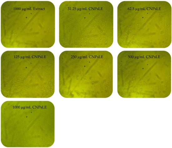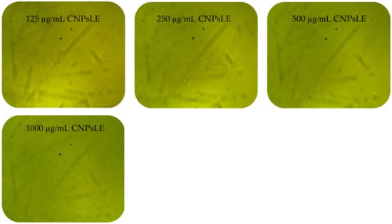 Judaica essential oils showed potent activity against the growth of Aspergillus fumigatus, Geotrichum candidum, Syncephalastrum racemosum, Candida albicans, Escherichia coli, Bacillus subtilis, and Streptococcus pneumonia, but failed to exhibit any activity towards the tested strain of Pseudomonas aeruginosa []. Nevertheless, another recent study [], reported the high sensitivity of Aspergillus niger, Candida albicans, Salmonella typhimurium, and Bacillus cereus towards A. judaica extract, whereas E. coli, Klebsiella pneumonia, and Shigella flexneri were observed with limited susceptibility to the same extract []. This variation in the overall potency of the extract might be attributed to the solvent used in the extraction. For example, it was reported that no antifungal potential was observed on the tested fungi, with the exception of C. albicans. Moreover, ethyl acetate extract did not exhibit the growth of A. fumigatus and Mucor spp.; the growth of C. albicans and A. fumigatus, however, was detected by methyl alcohol extract. These outcomes are consistent with the current results. CNPsLE exhibited excellent MIC values against B. subtilis (0.97 µg/mL) E. coli (1.95 µg/mL), S. aureus (3.9 µg/mL), K. pneumonia (4.1 µg/mL), and C. albicans (15.62 µg/mL), but the same microbes showed higher MIC values—B. subtilis (62.5 µg/mL), E. coli (15.65 µg/mL), S. aureus (15.62 µg/mL), K. pneumonia (31.25 µg/mL), and C. albicans (31.25 µg/mL)—when treated with the extract only (Table 2). Extract from Artemisia judaica, without combination with any nanoparticle, was reported, with MIC between 2.5 and 5 mg/mL against Candida species, while species of Bacillus showed MIC between 1.25 and 5 mg/mL []. Currently, both the extract alone and the CNPsLE complex failed to inhibit the growth of A. niger (Figure 4 and Figure 5). This is in agreement with previous studies, in which either complete resistance (Aspergillus niger and Alternaria alternate) or limited sensitivity (Fusarium solani) of tested fungi towards A. judaica extract was noted []. In addition, the enhanced efficacy of the current extract, when combined with CNPs, towards the tested microbes was also observed for mint extract loaded with CNPs against the examined pathogenic fungi []. Moreover, Torreya grandis essential oil (EO) loaded on the CNPs (particle diameter, 349.6 nm) offered stronger antibacterial activity compared to the non-loaded EO []. Furthermore, Achillea millefolium extract loaded on the CNPs showed a three-fold activity against B. subtilis and P. aeruginosa compared to the extract alone []. Recently, CNPs incorporated with aloe vera gel demonstrated stronger activity against Helicobacter pylori []. This might be due to the small size and strong surface charge of the CNPs, which facilitates the easy and effective interaction between the microbial cell wall and the CNPs loaded with the active compound/s [,] Therefore, the use of the CNPs as carriers for plant extracts and other therapeutic agents would hold great promise for enhancing the activity of active agents or leading to the discovery of novel active compound(s), only when loaded into the CNPs.