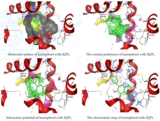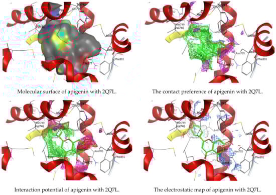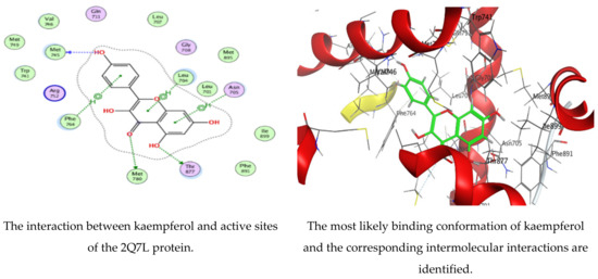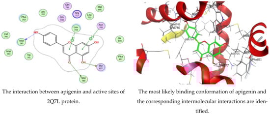 The MOE-Dock program’s default parameters were employed for the molecular docking of the kaempferol and apigenin. The ligands were permitted to be flexible to determine the proper conformations of the ligands and to produce the least energy structures. The best ligand conformations were examined with Prostate Cancer (2Q7L) for their binding interaction. From the docking studies, it was observed that both ligands (kaempferol and apigenin) are good inhibitors of the 2Q7L enzyme, with low scores for binding free energy of −6.61458 kcal/mol and −6.47986 kcal/mol, respectively. The binding mode of the inhibitors kaempferol and apigenin are within the active site of 2Q7L (Figure 8 and Figure 9). Kaempferol was bound deeply to the binding cavity of Prostate Cancer (2Q7L), interacting with the residues MET 745, MET 780, THR 877, LEU 704, ASN 705, and PHE 764 via the O 23, O 25, O 26, and three 6-rings.