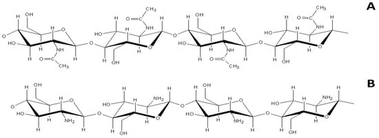(A) Chemical structure of chitin; (B) Chemical structure of chitosan.