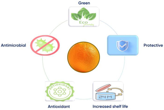 Furthermore, the preservation of minimally processed and ready-to-eat products demanded by consumers is becoming a major challenge as these foods experience rapid deterioration due to an increase in the respiration rate and ethylene production as well as an accelerated consumption of sugars, lipids, and organic acids during the ripening process. All of these modifications can lead to loss of texture and water along with undesirable changes in flavor and color produced by the senescence [142]. These spoilage problems can be prevented by applying edible films or coatings that create a semipermeable barrier to gas and water vapor, keeping the food quality in addition to improving its appearance, flavor, color, and nutritional value (Figure 4).