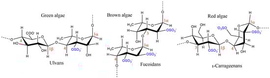The extensive reviews reported in the literature [,,,,,,,,,,,] on the structural features of macroalgae SPs reveal that, despite their chemical structural variability, some similar backbones are characteristic of each seaweed phyllo. The most simple and representative structural backbones of the SPs biosynthesized by brown, red, and green macroalgae are depicted in Figure 2.