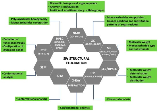 From the analysis of Table 1, it is evident that, besides the determination of total components (carbohydrates, sulfates, proteins, phenolics, glucuronic acid) and elemental (C, H, O, S) analysis, spectroscopic (FTIR, NMR) and chromatographic techniques (HPLC, GC, SEC, AEC) coupled to different detectors (MS, MALLS, RI, PAD, ELSD) are the most used techniques to attain the structural elucidation of SPs from macroalgae.