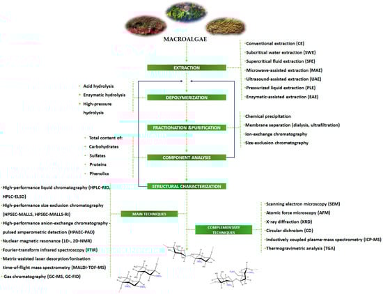 A general roadmap of the main steps and techniques and/or methods currently used for extraction and chemical characterization of sulfated polysaccharides from macroalgae is summarized in Figure 4.