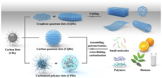 In recent decades, continuous advances in the synthesis and production of novel materials have further boosted the development of nanoscience and technology [1,2,3,4,5,6,7]. Quantum dots (QDs) are a relatively novel phenomenon in the world of the 0D nanomaterials’ family of minerals. Particles with sizes smaller than the exciton Bohr radius are called QDs [8]. Xu et al. (2004) discovered that luminous carbon nanomaterials may be produced by the purification of SWCNTs [9]. They have been identified as separate, quasi-spherical, clustered domains of many carbon atoms with a dimension of less than 10 nm. Then, in 2006, Sun et al. developed identical fluorescent (FL) carbon nanoparticles, which they dubbed carbon quantum dots (CDs), both dispersed in a solvent and as an extract in a solid form, both of which were fluorescent (FL) [10]. As a result, several researches have been carried out to investigate CDs from the perspectives of synthesis, characterization, and application [11,12]. When C atoms in CDs hybridize with surface ligands, the state of hybridization in the core of the CD is sp2. Surface ligands are derived from the basic materials themselves. The oxygenated groups found in surface ligands are often carbonyls, carboxylic acids, hydroxyls, and epoxy groups to name a few examples. In addition, carbonized polymer dots (CPDs) are gaining popularity, which are a novel type of CDs with a polymer/carbon hybrid structure that has begun to attract attention [13,14]. Thus far, the optical qualities of these QDs have been the most actively pursued field of research for them [15]. Photoluminescence (PL) is one of the most prevalent characteristics of QDs that researchers are looking for. One type of PL is excitation wavelength-dependent, whereas the other type is excitation wavelength-independent. PL is categorized into two separate types. PDs and CPDs are categorized as CD polymers by certain researchers, despite the fact that they are classed as CD polymers by others. The precursors and synthesis procedures for both PDs/CPDs and CDs, on the other hand, are almost similar. As a unique representative of the intriguing zero-dimensional carbon nanomaterials family, QDs have piqued the public’s curiosity due to their unique physical, chemical, and optical properties. QDs are now being studied further [16]. Oxygenated groups such as hydroxyls, carboxylic acids, carbonyls, and epoxy groups are the most common types of surface functional groups found on surfaces [17]. Additionally, due to their biocompatibility, CDs have been investigated as a potential green alternative to heavy metal-containing conventional semiconductor QDs. Simple preparation, a wide range of precursors, strong hydrophilicity, great sensitivity and selectivity, adjustable surface and fluorescence characteristics, minimal cytotoxicity, outstanding electron transport capability, and chemical inertness are just some of QDs’ many benefits [18,19,20,21].