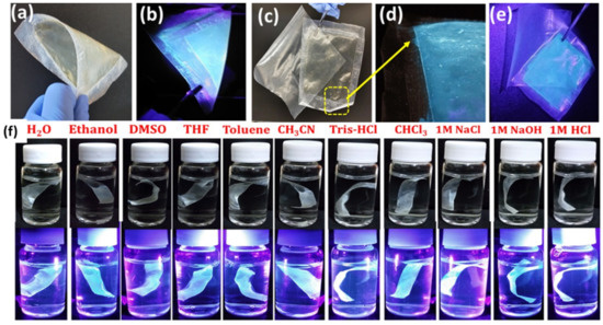 CDs-coated polypropylene film twisted in (a) daylight and (b) under UV light (c), comparative images of coated and noncoated films, (d) magnified image of (c,e) coated and noncoated films under UV irradiation, (f) coated films in different solvents and their daylight and UV irradiated images. Reproduced with permission from ref. [17].