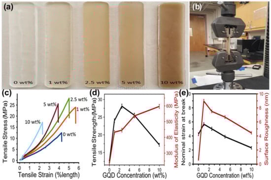 (a) Digital images of epoxy-GQD nanocomposites with various loadings of GQDs. (b) Instron setup for tensile test. (c) Stress–strain curves of various nanocomposites. (d) Tensile strength and modulus of elasticity against GQD concentrations, showing that the addition of GQDs made the epoxy stiffer and stronger. (e) Tensile strain and surface roughness of composites. Reproduced with permission from ref. [66].