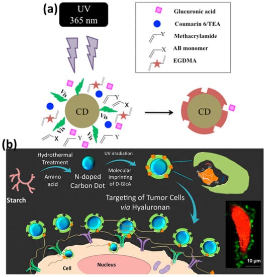 Caffeic acid has unique properties such as anti-inflammatory, antitumor, and immunomodulatory. In modern clinical practices, caffeic acid is frequently employed in the treatment of leukopenia, thrombocytopenia, and hemostasis, among other applications [97]. Hu et al. proposed CDs coated with MIPs based on a novel and highly sensitive technique for determining caffeic acid by a one-pot sol–gel method [89]. This platform took advantage of both the good sensitivity of CDs and the high selectivity of MIPs and showed great selectivity and affinity for caffeic acid. The intensity of the fluorescence signal by CDs@MIPs was found to decrease in a linear fashion with increasing concentrations of caffeic acid (range: 0.5–200 M) and the detection limit was identified to be 0.11 µM. Furthermore, caffeic acid was effectively detected in human plasma using the proposed approach. For the objective of targeted fluorescence imaging of cervical cancer, a CDs-embedded epitope imprinted polymer (C-MIP) was developed by Zhang and coworkers [98]. This approach utilized CDs as carriers, acrylamide as the major functional monomer, and N-terminal EGFR nonapeptides as templates. This platform was designed to recognize the epidermal growth factor receptor in a very specific manner (EGFR). The fluorescence response assays demonstrated that C-MIP possessed both high levels of sensitivity as well as excellent selectivity when it comes to the epitopes of EGFR. The linear range of fluorescence quenching was detected in the region from 2.0 to 15.0 µg/mL, and 0.73 µg/mL is the lowest amount that can be used to measure it. Moreover, targeted fluorescence imaging in vitro and in vivo demonstrated the capability to specifically detect EGFR [21]. Zong et al. developed ternary nanocomposite based on MOF-derived zinc oxide nanopolyhedra/GQDs/polyaniline via an in situ polymerization technique [99]. A flexible PET substrate with interdigital electrodes was used to make the nanocomposite. At ambient temperature, the gas-sensing capabilities of the sensors were tested by exposing them to varying amounts of acetone in a controlled environment. The experimental findings of this sensor revealed high response, strong repeatability, great stability, excellent selectivity, and rapid response or recovery features in response to low concentrations of acetone gas. Attributed to the synergistic effect and heterojunction generated in the nanocomposite, this sensor was reported to be a good candidate for detecting ppb-level acetone at room temperature. Cholesterol is a kind of lipid that plays an important role in the maintenance of the fluidity and structural integrity of cell membranes [100]. However, an elevated level of cholesterol in the serum has been shown to reduce blood flow, which can lead to a number of cardiovascular problems [101]. Since the detection of cholesterol is considered to be very significant in medical laboratories, this molecule was selected as the target molecule by several researchers. In a report, Hu et al. presented an approach that combines CDs doping with polymer encapsulation in order to develop a stable perovskite CH3NH3PbI3-based photoelectrochemical platform for cholesterol sensing [102]. The sensing probe was based on photoelectrochemical reactions. The water resistance was significantly increased due to the addition of a PVDF protective coating. Because of the functional carbonyl groups and hydroxyl groups that CDs possess, the perovskite grain boundaries were successfully passivated using these very inexpensive and easily accessible nanomaterials. A straightforward thermal polymerization technique, followed by elution with hexane, was used to anchor MIP onto PVDF-CH3NH3PbI3@CDs. The detection limit for cholesterol was found to be 2.1 × 10−14 mol/L, which is lower than the majority of the other techniques currently used to detect cholesterol. In the ongoing battle against cancer, the development of novel affinity techniques that can selectively detect, locate, and quantify biomarkers for diagnosis or prognosis is essential. Recent developments in the fields of glycobiology and cancer research have led to the discovery that an accumulation of hyaluronan is closely connected to the growth of tumors in patients [103,104,105]. In a report, Haupt and coworkers coupled CDs with MIPs to develop a sustainable advanced optical tool for investigating cancer biomarkers [93]. CDs were synthesized from starch and l-tryptophan using the hydrothermal synthesis. The MIP was prepared directly as a thin layer on the CDs by utilizing the photoluminescence of CDs to trigger localized photopolymerization under UV irradiation (Figure 5a). The initiator for the polymerization process was coumarin 6/TEA; functional monomers used were AB and methacrylamide; and the cross-linker was EGDMA. The MIP shell played the role of the specific recognition of glucuronic acid, which is a substructure (epitope) of hyaluronan. Core–shell CD-MIPs were then used for the biotargeting and cell imaging of hyaluronan in HaCaT cells, as well as in the HeLa cell line, which served as models for healthy cells and transformed cells, respectively (Figure 5b).
