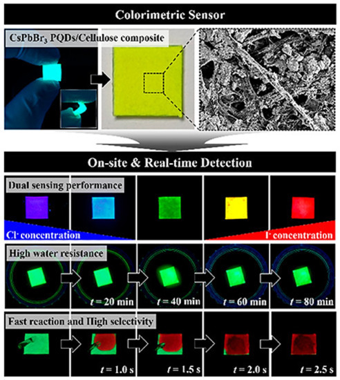 - Park, B.; Kang, S.-M.; Lee, G.-W.; Kwak, C.H.; Rethinasabapathy, M.; Huh, Y.S. Fabrication of CsPbBr3 Perovskite Quantum Dots/Cellulose-Based Colorimetric Sensor: Dual-Responsive On-Site Detection of Chloride and Iodide Ions. Ind. Eng. Chem. Res. 2019, 59, 793–801. [Google Scholar] [CrossRef]