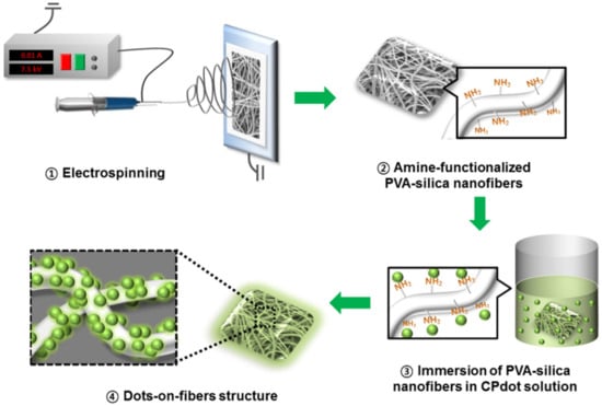 For practical purposes, it is vital to be able to quickly and selectively detect chemical warfare agent simulators. In a report, a unique chemical warfare agent sensor was fabricated (Figure 7) with a dots-on-fibers hybrid nanostructure by using a facile electrospinning technique and subsequent immobilization processes by Lee et al. [110]. This sensor system was based on conjugated polymer dots, which were immobilized on the surface of PVA–silica nanofibers. It was found that CP dots and amine-functionalized electrospun PVA–silica nanofibers interacted with one another by means of an electrostatic interaction, and this interaction was able to remain stable over a wide range of continuous mechanical forces. By evaluating the QY, it was possible to validate the significant increase in the fluorescence intensity of the dots-on-fibers, which supported the prospect of their usage as highly sensitive nanocomposites for applications involving sensing. Because of the transfer of electrons between the quinoxaline unit in the polymer and the organophosphorus simulant, the developed fluorescent DoF hybrid was quenched with the occurrence of a chemical warfare agent simulant. The detection time was almost immediate, and a very low limit of detection was obtained (1.25 × 10–6 M). In addition, the selectivity of the detection was demonstrated over other organophosphorus compounds.