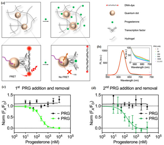 (a) FRET sensor that is based on QDs and is immobilized in the hydrogel. An image of a schematic depicting the diffusion of progesterone into the hydrogel and FRET-based sensor utilizing the TF–DNA binding mechanism, (b) Representative spectra of sensor response to progesterone. (c) the first cycle of progesterone (PRG) exposure and removal, the sensor exhibited a response. (d) The second cycle of progesterone exposure and removal elicits a sensor response when exposed to progesterone on a regular basis. Reproduced with permission from ref. [117] © 2023 American Chemical Society.