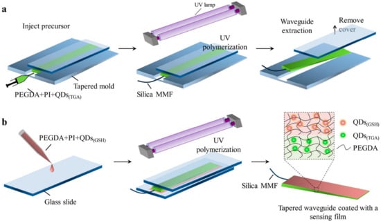 The sensing that can be conducted using hydrogels containing fluorescence QDs is based on the sensitivity of the PL of QDs to the surface state of the QDs. For a few instances, the objective substances destabilize the hydrogel system by interacting with the physiochemical bonds that are responsible for maintaining the three-dimensional structure. This, in turn, causes accumulation quenching of QDs, which enables the analyte identification to be accomplished by the use of this sensing sequence. The creation of soft and implantable optical waveguides by employing polymer hydrogels such as polyacrylamide, poly(ethylene glycol) diacrylate, and agarose has generated widespread interest in biosensing and photomedicines [118]. In contrast to its desirable mobility and cytocompatibility, hydrogel optical waveguides offer continuous monitoring without contaminating the samples being tested. This is only one of their many benefits. The fabrication of a hydrogel-based waveguide platform that is capable of in situ sensing in a variety of settings, as well as the continuous monitoring of metal ions with a rapid response, is of the utmost importance. In their study, Guo et al. presented the design and manufacturing of a tapered hydrogel waveguide that was covered with a thin sensing layer (Figure 10). This waveguide was used for ratiometric and in situ detection of metal ions with a quick response [119].