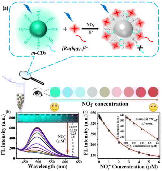 (a) Visual NO2– detection with m-CDs@ [Ru(bpy)3] Ratiometric probe. (b) Fluorescence spectra of m-CDs after adding NO2– (c) m-CD fluorescence vs. NO2– concentration. Reproduced with permission from ref. [124] © 2023 American Chemical Society.