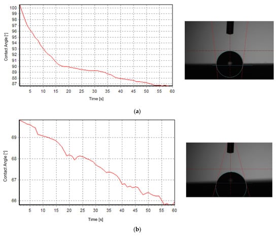Based on the obtained results, we can conclude that the tendency for the wetting angle behavior noticed in previous wettability tests (on a different device and with a different surface preparation) was maintained, but the values differ from those obtained in the earlier tests.