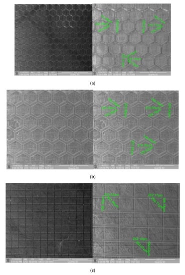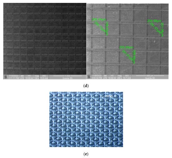 Using SEM, the dimensions of the obtained textures were measured and an average was calculated with three measurements. Thus, in the case of the hexagonal texture with two passes, an average value of the diagonal of 228.20 µm was obtained, and in the case of the hexagonal texture with four passes, an average value of 226.12 µm was obtained. In the case of the square texture with two passes, the average value of the diagonal was 291.64 µm, and for the square texture with four passes, the average value of the diagonal was 291.3 µm. In the case of both geometries, it can be mentioned that the measured values for three different textures are comparable, which indicates very good processing precision.