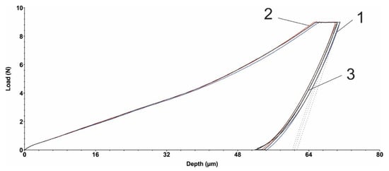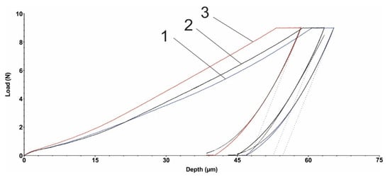 In order to follow the microindentation tests, a universal piece of UMT-2 (CETR-Center of Tribology Inc., Campbell, CA, USA) equipment was used with a 2 kg sensor and a maximum force of 10 N was applied. Additionally, a diamond Rockwell indenter with a radius of 200 µm was used, and the capacitive sensor measured the vertical indenter displacement.