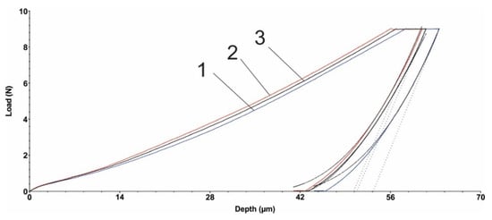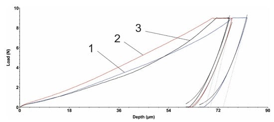 Figure 5 and Figure 6 show the load diagrams dependent on the vertical indenter displacement for the hexagonal texture microindentation test—two passes and four passes, respectively. Figure 7 and Figure 8 show the square texture microindentation test—two passes and four passes, respectively. The software package used enabled reading the microhardness values and Young’s modulus. These values are shown in Table 7 for the hexagonal texture and Table 8 for the square texture. Both tables also include the maximum depth (µm) for each sample tested. The research was conducted on three test samples of each textured type. The studied test samples showed the following average values in the cases of hexagonal texture (Table 7) and square texture (Table 8).