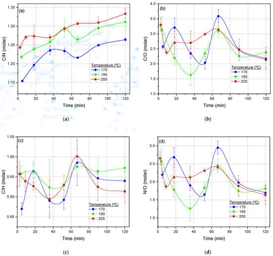 Evolution of the molar relationships for the three series of experiments carried out using MWR against reaction time (for details, please see Table S2). (a) C/N molar relationships; (b) C/O molar relationships; (c) C/H molar relationships and (d) N/O molar relationships. These molar relationships represent the average values of three independent samples for each reaction condition.