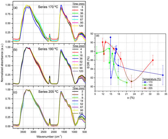 Similar results are observed when structural data are considered. The EOR (%) (Figure 1, pink lines) was calculated from the intensities of some FTIR spectroscopic features, as follows: EOR (%) = [I1640/(I2200 + I1640)] × 100, considering the study of conventional nitrile polymers [53]. The peak centered at ~1640 cm−1 can be assigned to conjugated C=C, to (C=N)n structures or to a combination of both, and the band centered at ~2200 cm−1 is related to nitrile groups. Representative FTIR spectra of the insoluble NH4CN polymers obtained using MWR are shown in Figure 3. An exhaustive interpretation of these FTIR spectra has been made comprehensively elsewhere (see, e.g., Refs. [54,55,56,57,58]); therefore, an exhaustive interpretation is not considered herein. The value of the EOR (%) varies from 0 for no reaction to 100% for a complete conversion of the nitrile groups. The EOR (%) is well established to increase with the degree of conversion when CTH is used to produce cyanide polymers [35,36]. Thus, if the standard errors are considered, the EOR (%) values for the 80 °C series are practically constant along the timeline since the conversion limit has been reached (Figure 1a, pink line). The EORs have an average value of 89 ± 1% for the reaction times considered. In contrast, the EOR (%) values for the other three series of experiments apparently do not have direct and linear relationships with the degree of conversion (Figure 1b–d, pink lines). A detailed representation of the EOR (%) against conversion degree shows, in some cases, an opposite behavior, i.e., some points with the greatest values of conversion present the lowest EOR (%) data (Figure 3d). However, the EOR (%) seemed to increase with the reaction time, although in a nonlinear way, in the MWR experimental series (Figure 1). As in the case of the chemical composition commented above, the EOR (%) value presents a singular point at the time of 67 min for the three MWR series.