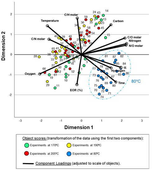 At this point, statistical methods, as useful analytical tools, are used to provide a global and interpretable vision of the results discussed above because: (i) the relationships between the experimental synthetic conditions and the properties of the final products are difficult to find using qualitative analyses, and (ii) well-established kinetic models cannot be used to describe the NH4CN polymerization assisted by MWR, as indicated in the Introduction. Thus, CATPCA was performed to determine the statistical significance of all data and the robustness of the syntheses for the gel fractions described. For that determination, the triplicate data of a total of seven reactions from different reaction times for each series at 80 °C, 170 °C and 190 °C and eight polymerizations for the series at 205 °C were considered, i.e., the data from eighty-seven independent experiments shown in Figure 1 and Figure 2 (Table S2). The CATPCA analysis based on ten physicochemical characteristics (α (%), % C, % H, % N, % O, C/O, N/O, C/N and C/H molar ratios and EOR (%)) and two categorical variables (temperature and time) for 80 °C, 170 °C, 190 °C and 205 °C sorted the reactions under study into two defined groups. Thus, all reactions resulting at 80 °C grouped together (Figure 4). The first two dimensions of the CATPCA together explained 91% of the variance in the dataset and were supported by a total Cronbach’s α of 0.97 (maximum value = 1), indicating the high reliability of the detected pattern in the dataset [59]. The estimates and bootstrap 95% confidence intervals showed that variations in temperature, hydrogen and molar C/H were significantly higher than the rest, while the variations in nitrogen, oxygen, molar C/O and N/O were the lowest (Table S3, Figure S1). The EOR values present a positive correlation with the reaction time, with the % O and with C/N molar and, therefore, logically, a negative correlation with the % N. However, the EOR seems independent of the reaction temperature and shows an unexpected negative correlation with the conversion degree, α (%). The % O presents strong negative correlations with the % C and % N and a negative correlation with α (%) but, at the same time, shows a slight positive correlation with the reaction time and seems independent of the temperature. However, α (%) presents an unexpectedly low negative correlation with the reaction time and positive correlations with % C and % N, but it is independent of the temperature. In fact, the temperature only presents a positive correlation with the C/N molar. In this approach, including the 80 °C series data, a direct correlation between time and conversion is shown since the greatest conversion values are reaching for this series for the longest reaction times considered, but an inverse correlation between temperature and H% is observed, and a direct correlation between EOR and % O is conserved.