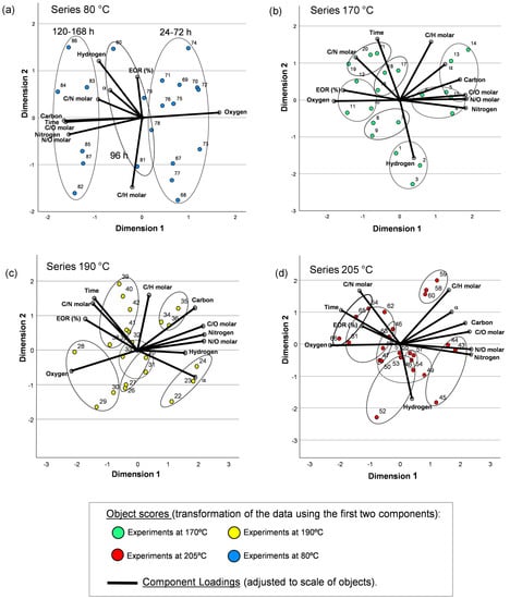 CATPCA biplot using the experimental synthesis conditions used, reaction time, conversion degree values, elemental composition and calculated EOR data (%) from the FTIR spectra for the NH4CN-derived polymers obtained as variables. Component loadings of variables are indicated by vectors and object scores of experiments by dots. In this analysis, each experimental series was analyzed independently: (a) 80 °C series; (b) 170 °C series; (c) 190 °C series; and (d) 205 °C series. The reaction time for each synthesis is indicated in Table S1. The ellipses surround the most related experimental results.