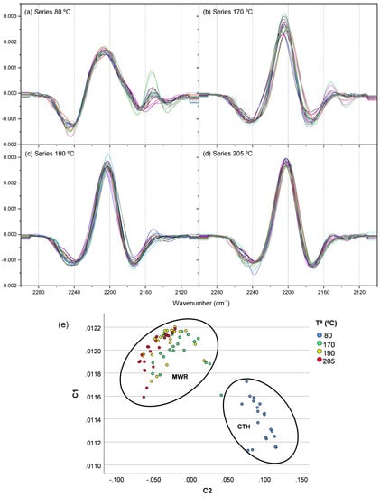 Second spectral derivatives in the FTIR nitrile spectral region (2300–2100 cm−1) from gel fractions of the cyanide polymerizations: (a) using conventional heating at 80 °C and (b–d) assisted by MWR at different temperatures, 170, 190 and 205 °C, respectively; (e) PCA of the dispersion of the second derivatives of the IR nitrile spectral region (2300–2100 cm−1). The FTIR spectra are from each of the triplicates of the samples synthesized using the conditions shown in Table S1 (please compare with the dendrogram in Figure S6). The second derivatives of the FTIR spectra of the 80 °C series correspond to the FTIR spectra previously reported in [29], shown here as control experiments. A total of ninety FTIR spectra were considered (Figure S6). Similar to Figure 4, the experiments are grouped into two main clusters: a heterogeneous group (MWR) and a homogeneous group consisting of the experiments performed at 80 °C (CTH).