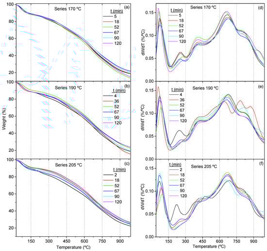 (a–c) Representative TG curves for NH4CN polymers synthesized at different temperatures and reaction times as indicated in the legends of the figure; (d–f) DTG curves corresponding to the TG curves.