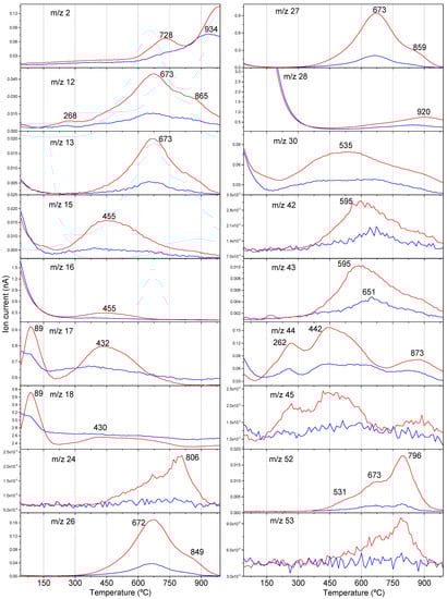 Significant differences were found through analysis of the thermal behavior of the different series from the MWR polymerizations (Figure 7). For example, the % in weight of the chars after heating the samples up to 1000 °C is higher for the series synthesized at 205 °C and notably greater than the percent of char in the CTH series (Figure 7a–c and Figure S7). Generally, the increase in the char for these types of polymers is related to a greater degree of cross-linking by oxidized groups, such as intermolecular amide bonds or intramolecular bonds, which lead to the formation of lactams, and by a greater conjugation in the system [64]. This fact can be related to higher oxidation in the macromolecular system that is observed for the series at 205 °C, but again, these relationships are not so clear for the series at 170 °C and 190 °C, unlike for the 80 °C series (please compare Figure 1 with Figure S7). In addition, annelation processes cannot be ruled out in the generation of the chars since the TG/MS curves show m/z 2 fragments linked to the loss of H2, which can be associated with the generation of new rings at high temperatures (Figure 8).
