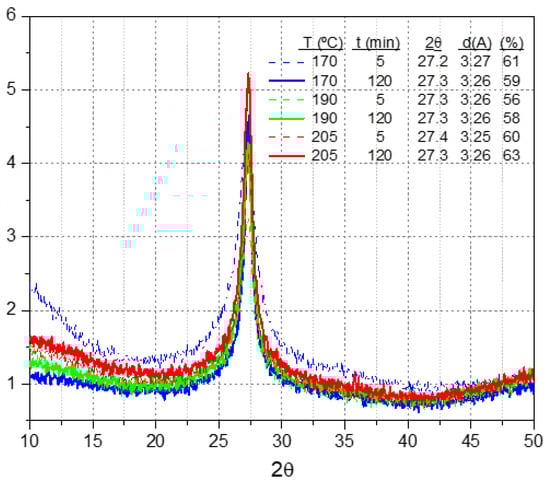 Thus, the PCA of the DTG curves indicates a clear clustering of the samples based on the temperature and the reaction time, in strong agreement with the results discussed above. Therefore, the shape of the DTG is statistically consistent for classifying HCN-derived polymers as a function of the synthetic conditions used for their production.
