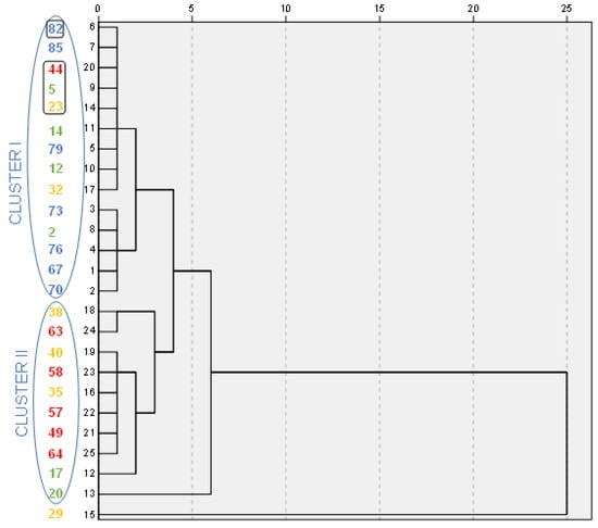Hierarchical dendrogram based on PCA of DGT curves. Two clusters could be observed (indicated by ellipses). One of these groups (Cluster I) together, mostly samples taken at lower temperatures, and the other cluster (Cluster II) at higher temperatures or longer reaction times. The numeration of the experiments corresponds with Table S1. In blue, the samples from the 80 °C series, in green from the 170 °C series, in yellow from the 190 °C series and in red from 205 °C series. The samples in boxes are samples synthesized using equivalent reaction times based on the specifications of the microwave manufacturer.