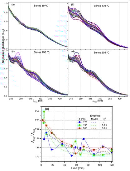UV-Vis spectra of the raw soluble fractions (sol fractions) from the cyanide polymerizations: (a) using conventional heating at 80 °C, and (b–d) assisted by MWR at different temperatures, 170, 190 and 205 °C, respectively, from each of the triplicates of the samples synthesized using the conditions shown in Table S1; (e) evolution of the relationship between the intensity of the main bands observed in the UV-Vis spectra from the MWR series over time.