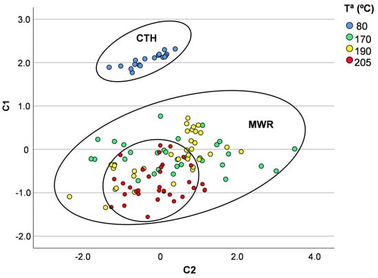 PCA of UV−Vis spectra data obtained (235–450 cm−1). Again, the experiments are grouped into two main clusters. A homogeneous cluster corresponding to the 80 °C series and a heterogeneous cluster with the rest of the series. In this analysis, the samples corresponding to the 205 °C series tend to appear together within the heterogeneous cluster. Ellipses mark these groupings.