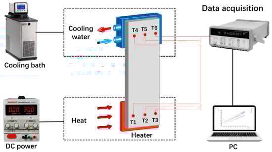 The experimental setup for evaluating the heat transfer performance of the FOHP is displayed in Figure 2. The measurement apparatus mainly included a ceramic electric heater, DC power supply, cooling block, cooling bath, data acquisition system, and computer. The heating unit consisted of a ceramic electric heater with a size of 25 mm × 25 mm and an adjustable DC power supply. The heating power input added to the FOHP was controlled by adjusting the voltage and current of the DC power supply. The condensing section of the FOHP was cooled using a cooling block, which was connected to a cooling bath, and the cooling temperature for this experiment was set at 20 °C. Six thermocouples (T1~T6) were used to monitor and record the real-time temperature variation of the FOHP. Three thermocouples were uniformly arranged in the center of the evaporating section and condensing section of the FOHP, respectively. The measured temperature data were collected using a data acquisition system and then transmitted to the computer. In addition, to improve the accuracy of the measurement data, conductive silicone grease was applied between the contact surfaces to reduce the contact thermal resistance. During the experiments, the entire FOHP was wrapped in thermal insulation materials with a thickness of more than 5 cm to minimize heat loss. By comparing the inlet and outlet water temperatures, the maximum heat loss of the system was 1.43%.
