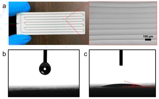 To characterize the surface morphology and wetting performance of the inner channel in the 3D-printed FOHP, the prepared FOHP was cut into two halves in the axial direction. Figure 4a exhibits the inner surface morphology of the flow channels in the FOHP, which was observed using a scanning electron microscope (SEM). As shown, the inner surface of the channel presented small groove structures, which were attributed to the features of the FDM manufacturing process. The unique groove structure would improve the roughness of the inner surface and further facilitate the evaporation of the working fluid. The internal channels of the FOHP consisted of four turns. The cross-section of the grooves was circular, and the diameter was 2 mm. The distance between the two adjacent internal channels was 1 mm.