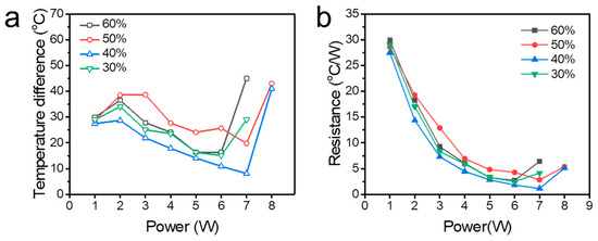 Figure 5 shows the thermal performance of the 3D-printed FOHP with different filling ratios when the heating power input increased from 1 W to 8 W. The quantity of working fluid played an important role in the thermal performance of the FOHP. In general, when too much working fluid was filled into the FOHP, the liquid plugs would restrict the oscillating motion, leading to poor thermal performance. On the contrary, when the FOHP was loaded with too little working fluid, there would be insufficient liquid to absorb and convert the thermal energy added onto the evaporating section into the kinetic energy of the working fluid, thereby resulting in the phenomenon of dry-out. Therefore, an optimum filling ratio should exist in the oscillating heat pipe. Figure 5a shows the temperature difference evolution of the FOHP filled with different filling ratios (30%, 40%, 50%, and 60%) at various heating power inputs. As shown, when the heating power input increased from 1 W to 7 W, the FOHP with a filling ratio of 40% had the smallest temperature difference between the evaporating section and condensing section compared to the other three FOHPs. When the heating power input was 7 W, the temperature difference of the FOHP with a filling ratio of 40% was only 8.1 °C. However, when the heating power input was continuously increased to 8 W, the temperature difference of the FOHP increased sharply, indicating that the operating limitation was reached.