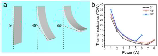 In the following study, the FOHP filled with 40% working fluid was used to investigate the effect of bending on the heat transfer performance. Figure 6 exhibits the thermal resistance evolution of the 3D-printed FOHP tested at different bending angles. As shown in Figure 6b, it should be noted that the thermal resistance of the FOHP decreases when the heating power inputs increases and a larger bending angle results in more significant thermal resistances, especially when a low heating power input is added to the evaporating section. As shown, without bending, the thermal resistance of the FOHP dropped from 27.5 °C/W at 1 W to 7.3 °C/W at 3 W and 2.8 °C/W at 5 W. When the FOHP was bent to 90°, the corresponding thermal resistances were 35.1 °C/W, 10.6 °C/W, and 4.4 °C/W. On the other hand, when the FOHP was not bent, the operating limit of the FOHP was 7 W. While the FOHP was bent to an angle of 90°, the operating limit of the FOHP dropped to 5 W. Therefore, the experimental results showed that bending would cause additional thermal resistance of the FOHP and decrease the operating limitation, but the additional thermal resistance was able to reduce by increasing the heating power input at the evaporating section. In addition, it was clearly seen that when the heating power input was increased from 1 W to 5 W, this 3D-printed FOHP presented good thermal performance and low thermal resistance with bending angles ranging from 0° to 90°.