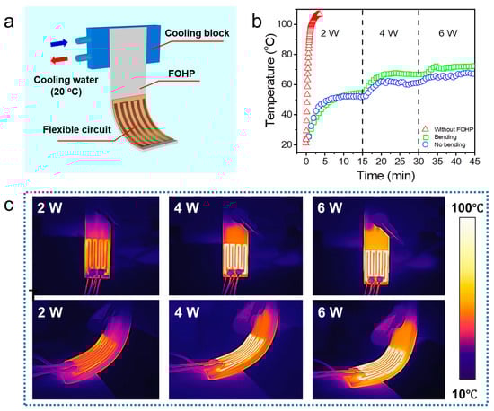 Finally, due to its excellent heat transfer performance and flexibility, we further demonstrated our developed FOHP for the thermal management of flexible printed circuits. As shown in Figure 7a, a flexible printed circuit, which could generate heat ranging from 2 W to 6 W, was attached to the evaporating section of our FOHP with thermal grease. A cooling block with a constant temperature of 20 °C was placed on the condensing section of the FOHP. In addition, a K-type thermocouple, which was placed on the surface of the flexible printed circuit, was used to monitor and record its real-time temperature evolution. The heating generated by the flexible printed circuit was first transferred to the evaporating section of our developed FOHP, exciting oscillating motion in the pipe, and then carried to the condensing section, where the heat was further dissipated by the cooling water.