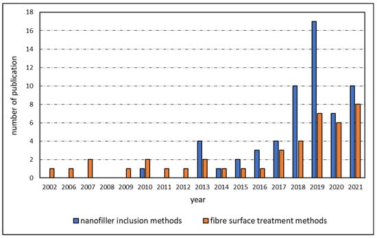 As presented in Figure 1, the literature survey shows that the study of nanofiller integration and fibre surface treatment in thermoplastic composites has increased in recent years. Even though interfacial engineering in thermoplastic composites began with fibre surface modification using rare earth solution treatment in 2002 [9], the relative growth in fibre treatment methods is considerably slower compared to the integration of nanofillers. Among the different fibre surface treatment methods applied to thermoplastic composites, polymer sizing is the most-used method, followed by gamma irradiation, electron beam irradiation, plasma treatment, chemical grafting, and coating methods. Only a few research works were found that used ozone treatment on fibres. Heat treatment on fibres is a recently-developed method that uses a conventional oven, IR heaters, or a naked flame to treat the fibre surface and increase its ability to bond with the thermoplastic matrix. The heat treatment of fibres has been shown to improve fibre surface roughness, wettability, and interfacial properties. The use of plasma treatment has been gradually declining over the past decade because dry fibre treatment methods like using plasma are known to damage the fibre material. Thus, the number of publications involving the wet chemical method is relatively higher than the dry mechanical interlocking method.