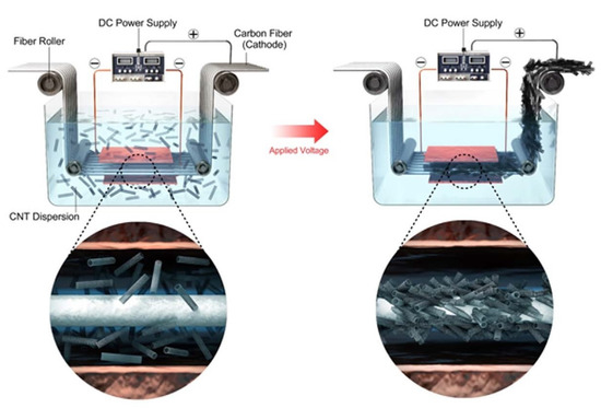 In the electrophoretic deposition (EPD) method, charged micro/nanoparticles (mixed in the electrolyte suspension) move towards the carbon fibre with an opposite charge under the application of electric current. The charged nanoparticles are then physically deposited on the fibre surface in a random orientation [12].