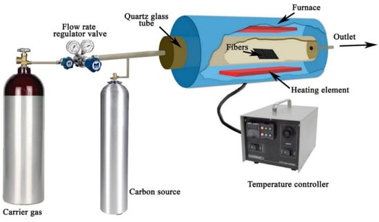 In the chemical vapor deposition (CVD) technique, the fibre is placed inside a quartz tube with a volatile catalyst precursor and heated using a hydrocarbon source like ethane or methane gas [17]. The reaction burns the precursor and allows it to settle after vaporization on fibre material, thereby depositing CNT onto fibre surfaces, as shown in Figure 3. Sometimes, carrier gases like hydrogen and argon are introduced along with hydrocarbon sources to improve the reaction rate in the quartz tube, as shown in Figure 3.