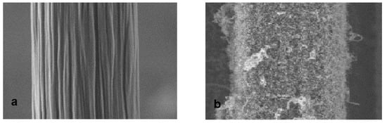 In another CVD method, CNTs were deposited on CFs using Fe (C2H5)2 (ferrocene) as a catalyst and ethanol as a carbon source [19]. The process was conducted at 750 °C for 900 s. The CVD process created a continuous and dense deposition of CNTs on CF as shown in Figure 4. Catalytic deposition in the CVD process created defects in CFs, reducing the CNT grafted fibre strength by 12%. PP (polypropylene) matrix penetrated the CNTs, which increased the IFSS by 35% for modified CF/PP samples. The fibre/CNT joint fracture was observed to be the dominant failure mode for the grafted fibres.