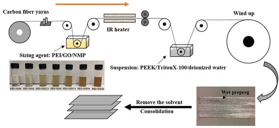 Chen et al. [26] enhanced the interfacial bonding between CF and PEEK using a mixture of polyetherimide (PEI) and graphene oxide sizing on CFs in different mixing ratios. The bare carbon fibres were pulled through the sizing agent, a mixture of PEI granules dissolved in N-methyl-pyrrolidone (NMP) and GO. The carbon fibres coated with PEI and GO were then IR heated at about 300 °C. After drying, the sized CFs were pulled through a suspension mixture of PEEK, Triton X-100, and deionized water, as shown in Figure 5. After PEEK suspension, carbon fibres were placed in an oven and consolidated to produce CF/PEEK prepregs. The CF/PEEK prepregs coated with PEI and GO were stacked in unidirectional orientation and hot-pressed to produce composite laminates.